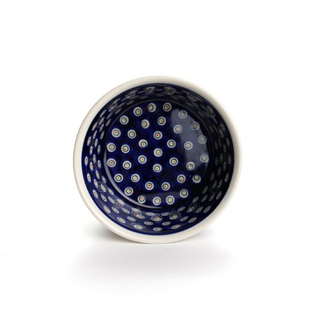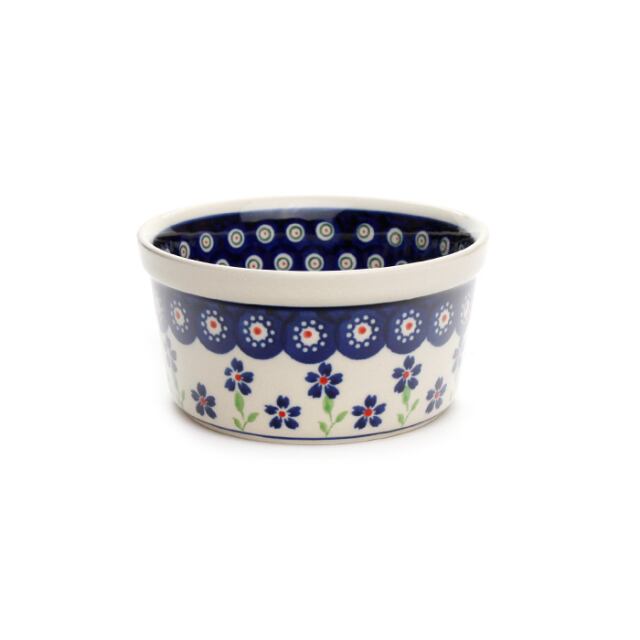 底面から垂直に立ち上がった側面のシルエットが特徴的な大きめのココットボウル。内側に絵付けされているポーリッシュポタリーならではの仕様で、一層可愛らしい印象です。オーブンを使う料理や銘々の焼き菓子型などでも活躍してくれます。