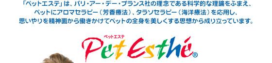 ペットエステは、パリ・アー・デー・プランス社の理念をふまえ、アロマセラピー(芳香療法)、タラソセラピー(海洋療法)、東洋式マッサージ技法を応用し、思いやりを精神面から働きかけ、世界初のカラーレストレーションシステムを用い、心身共に美しくする思想から成り立っています。そのためペットエステの製品群は、皮膚健常化のために死海の塩、ミツバチがさまざまな樹木から収集して作り出す今話題の物質プロポリスや天然植物保湿成分、海洋植物成分、天然保湿因子NMF等をたくみに応用し、愛するペットの被毛皮膚を修復改善する事を目的とする、総合的なペットエステティック製品です。特にぺットエステの製品には、古くから世界中で使用されて来た安全性の高い植物原料、天然ハーブ、その他植物由来の新規天然原料を使用しています。動物由来の原料は、一切使用していません。また、製品開発や販売の過程で行われる動物実験は、動物への虐待行為であり反対しています。原料は、自然界に存在するバクテリア等の微生物により分解できる生分解性の高い天然植物原料を使用しています。海や川を汚染しない地球に優しい製品の開発を続けています。