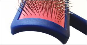 スリッカーブラシは長い巻き毛等の難しいコートのブラッシングおよび、もつれ毛の除去を完璧にこなします。持ち手は長めで曲線のグリップ付き持ち手は届きにくい場所への作業を容易にします。