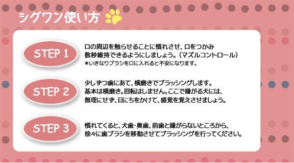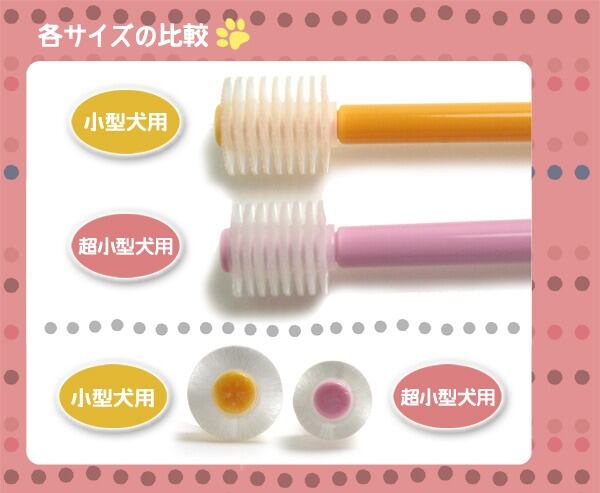 360°型なので、どこからでも磨け、従来の歯ブラシのように、毛の裏面のプラスティック部分が歯や歯ぐきにカチカチ当たることがなくて安心。0.07mmの超極細毛を全周に採用。柔らかい曲線ブラシが、ワンちゃんの歯ぐきも優しくマッサージします。約2万本(従来歯ブラシの20倍)の毛数でブラッシングするので、短時間で口臭や歯周病の原因である汚れやプラークを徐去します。